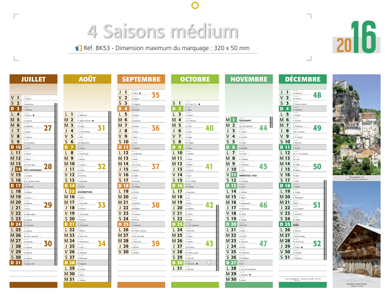 Entreprises, faites plaisir à vos collaborateurs, partenaires et clients en leur offrant un calendrier publicitaire en cette nouvelle année. Faites confiance à Kelcom, le spécialiste de la publicité par objet pour vous offrir des supports de qualité. C'est un excellent moyen de communication car il vous permet d'être aux côtés de vos cibles pour leur présenter vos services et produits. Un calendrier accroché au mur attire l'attention du public. Ainsi votre image sera découverte par un public plus grand pour déclencher la relance de vos activités. Nous travaillons à rendre votre image plus attrayante en misant sur la qualité de la matière utilisée et la beauté de nos produits. Le calendrier bancaire publicitaire moyen 4 saisons, Medium Les 4 Saisons en est une illustration parfaite. Il est conçu sur papier couché brillant 115 g et comporte diverses couleurs. On y trouve également de belles images pour la rendre plus attractive. Les utilisateurs peuvent l'utiliser comme décoration murale ou s'en servir pour planifier leurs activités car on y trouve les dates des fêtes, les semaines numérotées, les lunaisons, les quantièmes et les congés scolaires. Profitez de cet outil pour booster vos affaires en contactant Kelcom.
