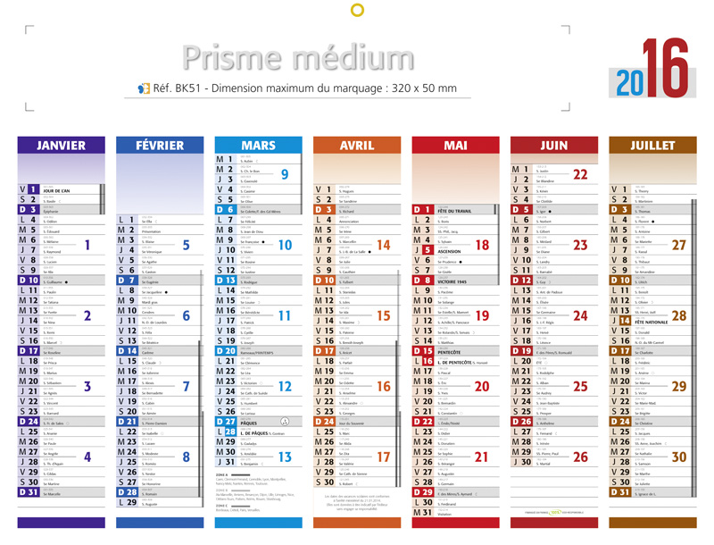 Entreprises, trouvez des formules innovantes pour fidéliser votre clientèle. Kelcom vous en donne l'occasion avec son calendrier bancaire publicitaire de couleur, Medium Prismabanque. C'est un excellent cadeau à offrir à vos clients en ce début d'année pour marquer votre présence permanente à leur côté. Profitez également de cette opportunité pour vous faire connaitre du grand public. Medium Prismabanque est un beau calendrier (avec plusieurs couleurs) qui part de Janvier 2013 à Janvier 2015. Il présente au recto comme au verso 7 mois qui porte chacun une couleur. Les semaines sont mises en relief de sorte à facilité la lisibilité du calendrier. Vos clients peuvent l'utiliser pour ficeler leur agenda, établir leurs différents programme pendant leur temps de congés ou de vacances. Profitez également de l'espace qui vous est réservé pour présenter votre structure, ses produits, ses coordonnés et surtout la situation géographique de quelques agences. Tout ceci pour renforcer les liens entre vos clients et vous. N'hésitez donc pas à nous contacter si vous souhaitez obtenir Medium Prismabanque pour vos différentes campagnes publicitaires et autres événements visant à vous faire connaitre du grand public. Récompensez vos clients avec la qualité en choisissant les produits de Kelcom, le professionnel de la communication.