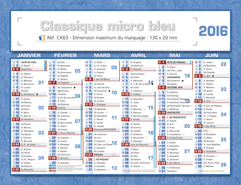 • Grille : 6 mois recto/verso Fêtes / N° semaine / lunaisons / congés scolaires