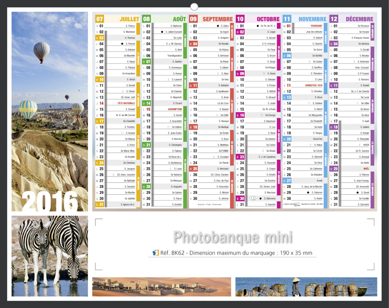Un mini calendrier publicitaire pour vos collaborateurs, partenaires et clients vous permettra de gagner la bataille de la fidélisation. Ils l'utiliseront pour établir leur agenda mais aussi pour décorer leur maison. C'est ainsi que les autres consommateurs prendront connaissance de vos produits et services via l'espace réservé à votre publicité. De cette façon, vous aurez moins de difficultés à écouler vos produits. Associez votre image aux produits de Kelcom et vous prendrez de l'avance sur vos concurrents. Notre mini calendrier publicitaire, Mini Décobanque pourra mieux vous mettre en valeur. Il est conçu sur papier couché brillant et comporte de belles images de fruits et de fleurs exotiques pour donner envie à ses utilisateurs de le faire connaître aux autres en l'accrochant à un support. Il présente les mois, semaines numérotées, fêtes, lunaisons et congés scolaires pour permettre à ses utilisateurs de mieux organiser leurs activités. Profitez d'un espace de 190 x 50 mm pour faire votre pub. Votre image associée à ce beau calendrier attirera les regards des consommateurs. Faites-vous une place de choix sur le marché en contactant Kelcom. Nous avons les hommes et les idées pour vous garantir un maximum de satisfaction.