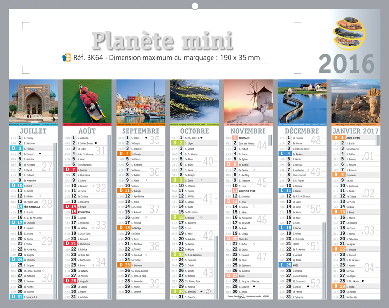 Offrir un petit calendrier publicitaire à vos collaborateurs, partenaires et clients leur fera certainement plaisir. Ce cadeau vous rapprochera de vos partenaires pour augmenter votre popularité. Le public vous connaîtra mieux, ce qui contribuera à booster vos ventes. Le calendrier Mini planète est conçu sur papier couché brillant. Il présente des images de paysages pour offrir davantage de plaisir visuel. Ses utilisateurs s'en serviront pour établir leur emploi du temps ou pour décorer leur maison. Grâce à son cordonnet, on peut facilement l'accrocher à un support. Sa grille comporte 14 mois, dont Décembre précédent et Janvier de l'année suivante. Les semaines numérotées, les lunaisons et les congés scolaires sont perceptibles. Votre image est ce qui compte le plus pour Kelcom, c'est la raison pour laquelle nous vous réservons un espace de 190 x 35 mm pour faire votre pub (produits, services, situation géographique ). Les utilisateurs éprouveront du plaisir à accrocher ce calendrier marqué de votre image. Profitez de cette opportunité pour vous faire une place de choix sur le marché. Passez votre commande dès maintenant. Kelcom vous accompagne dans quête de visibilité pour vous aider à vous démarquer de vos concurrents.
