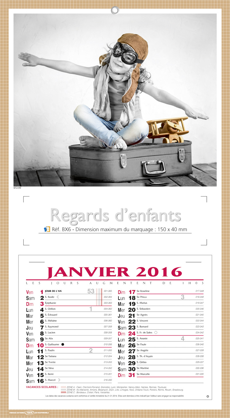 Marquez votre reconnaissance vis-à-vis de vos clients en leur offrant en début d'année un calendrier publicitaire portant votre effigie. À travers ce calendrier personnalisable, vous vous rapprochez davantage de vos clients et vous leur permettez de connaître vos nouveaux services et produits. Ainsi, vous arriverez à les fidéliser pour booster vos ventes. Nous mettons tout en oeuvre pour vous garantir une meilleure image. C'est pourquoi nous vous proposons divers supports publicitaires dont le calendrier bloc artiste, Enfant. C'est un produit haut de gamme pour vous permettre de rehausser votre image. Il est à base de carton couché 400 g et comporte 12 feuillets papier offset avec reliure. On y trouve des images d'enfants coquets pour embellir le mur des usagers et attirer l'attention du public. En l'offrant à vos clients, vous leur donnez l'occasion de mieux planifier leurs programmes car il mentionne les dates des fêtes et congés scolaires ainsi que les semaines, lunaisons et quantièmes. Un espace vous est accordé pour faire passer un message. Il est bénéfique d'associer votre image à celle des enfants sur un carton de qualité. Si vous voulez expérimenter l'efficacité de la publicité par les calendriers, contactez nous pour passer votre commande.
