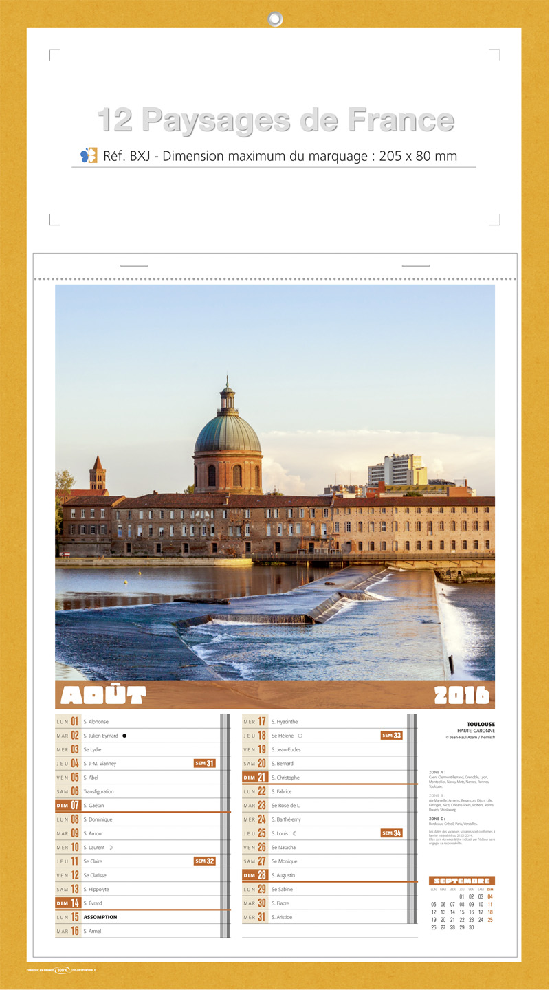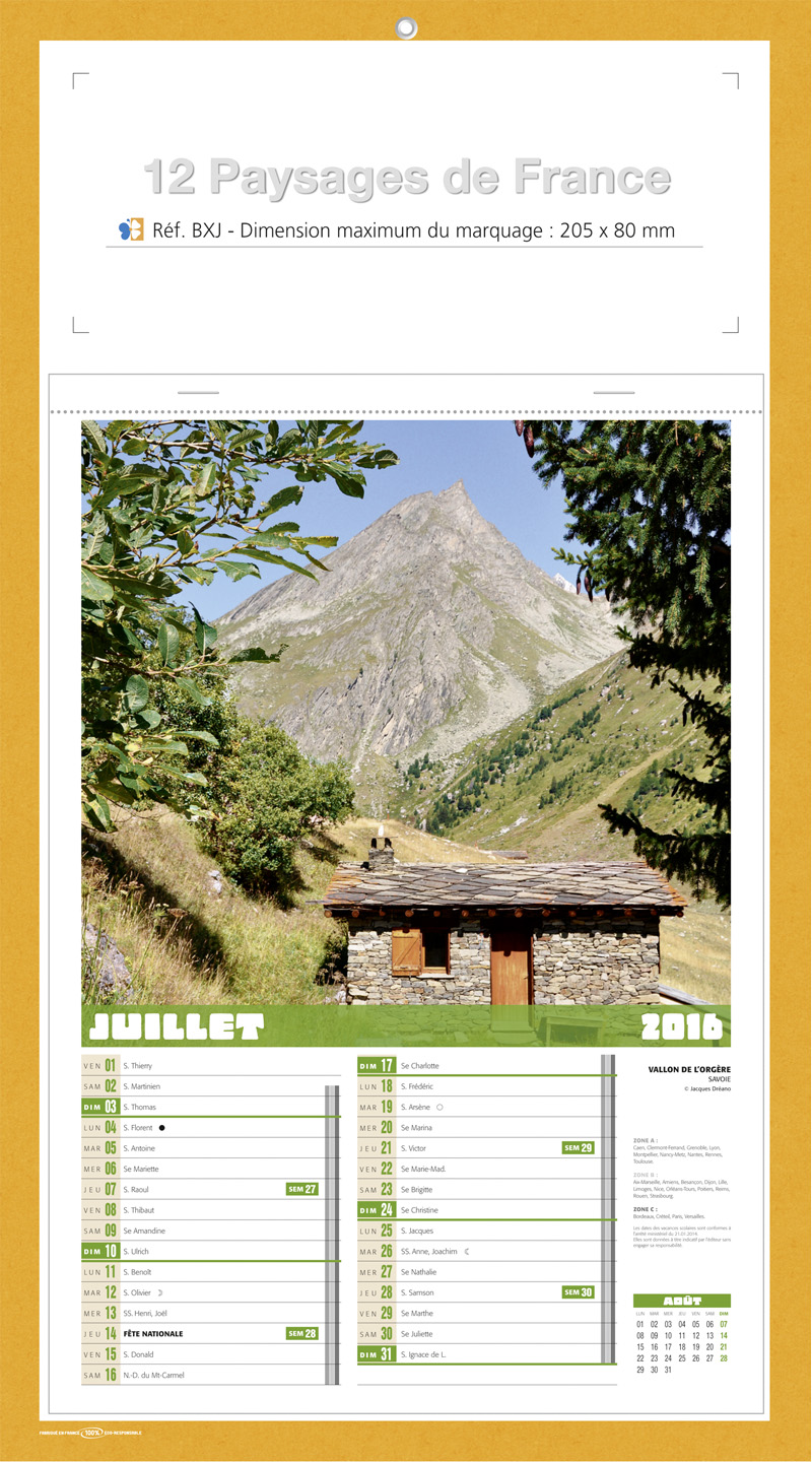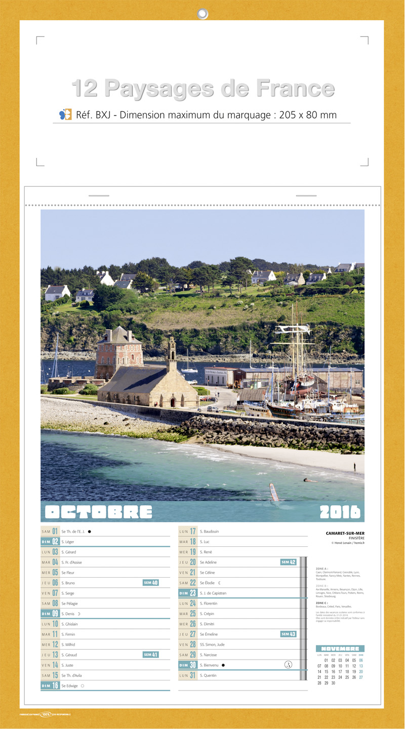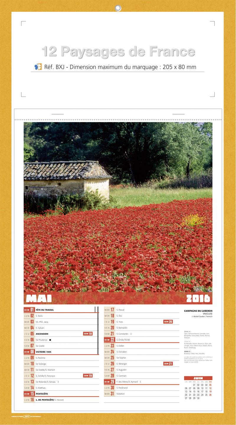 Pour marquer la différence entre vous et vos concurrents, utilisez de bons outils de communication qui vous valorisent. Un calendrier avec une large place publicitaire peut vous aider à vous imposer comme leader dans votre domaine d'activité. Il vous permettra de maintenir une bonne relation avec vos clients, partenaires et collaborateurs et aussi d'atteindre d'autres cibles. Offrez le calendrier Paysage français à votre public. Il vous permettra d'améliorer votre image car il est attractif et séduisant. Son support est en carton couché 400g, il possède 12 feuillets couché brillant qui sont facilement détachables après utilisation. Notre calendrier est mensuel et les utilisateurs peuvent y faire des annotations grâce aux espaces réservés en face des dates. Sur ce calendrier, les congés scolaires, les fêtes annuelles et semaines numérotées sont clairement visibles pour s'adapter à ceux qui souffrent de maux d'yeux. Nous vous avons réservé une zone de 205 x 80 mm pour vous adresser à vos clients en leur publiant vos produits. Kelcom vous offre l'occasion d'offrir la qualité à vos cibles. Contactez-nous dès maintenant pour améliorer votre image à travers nos produits publicitaires. N'hésitez pas, nous sommes là pour vous.