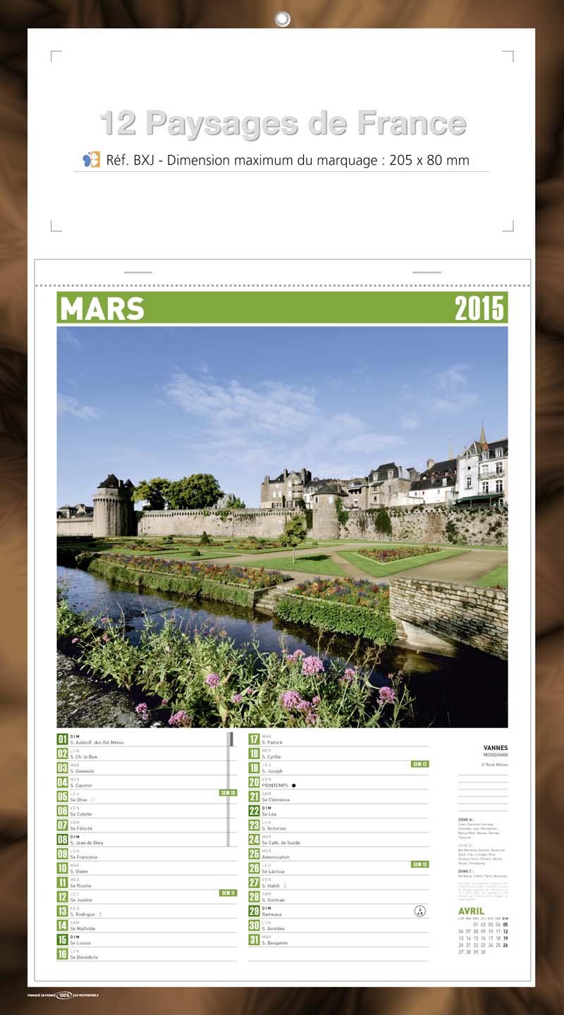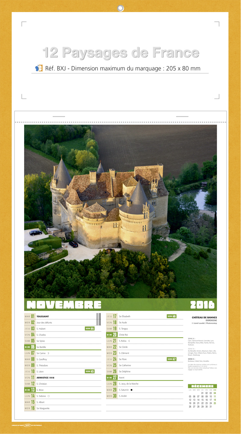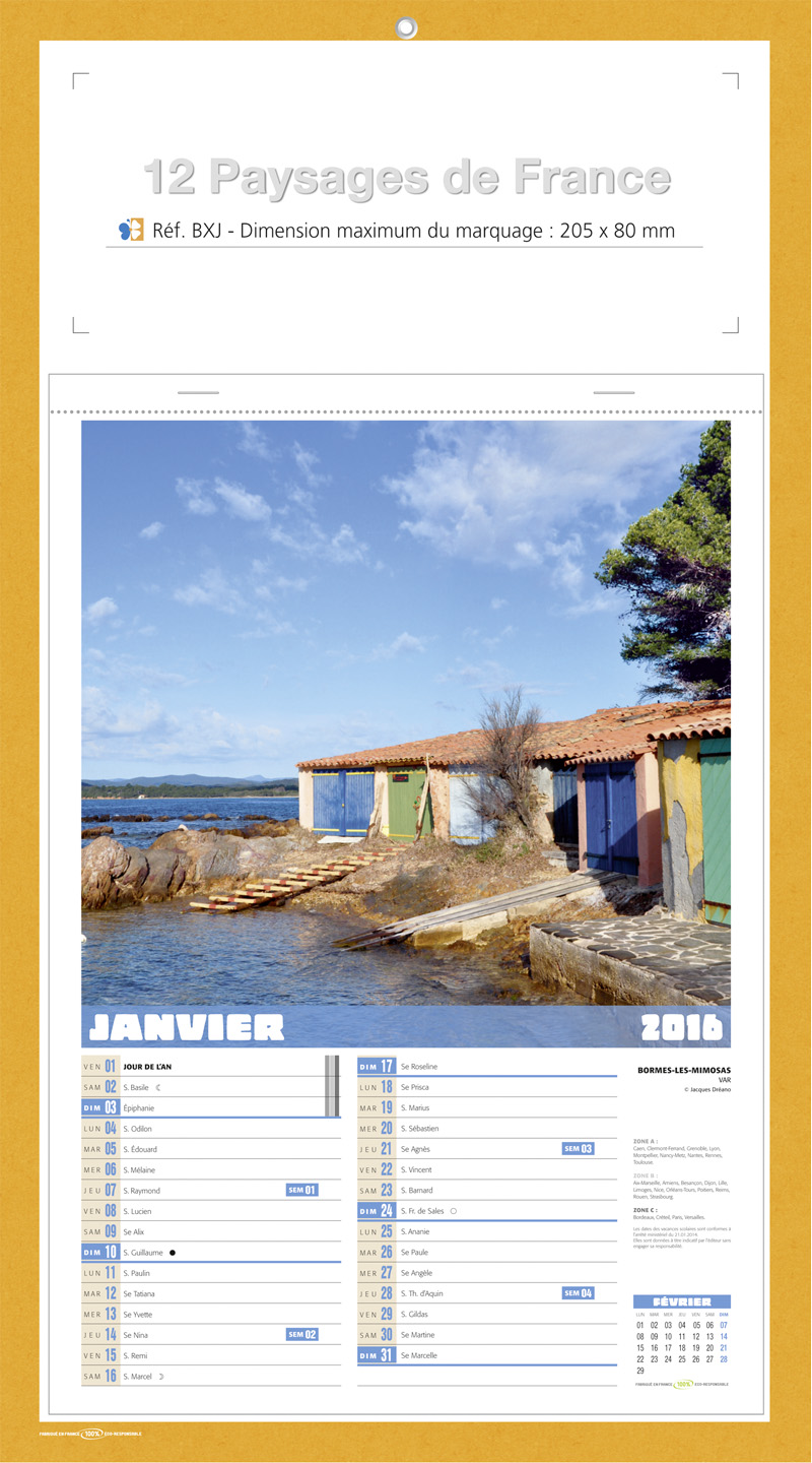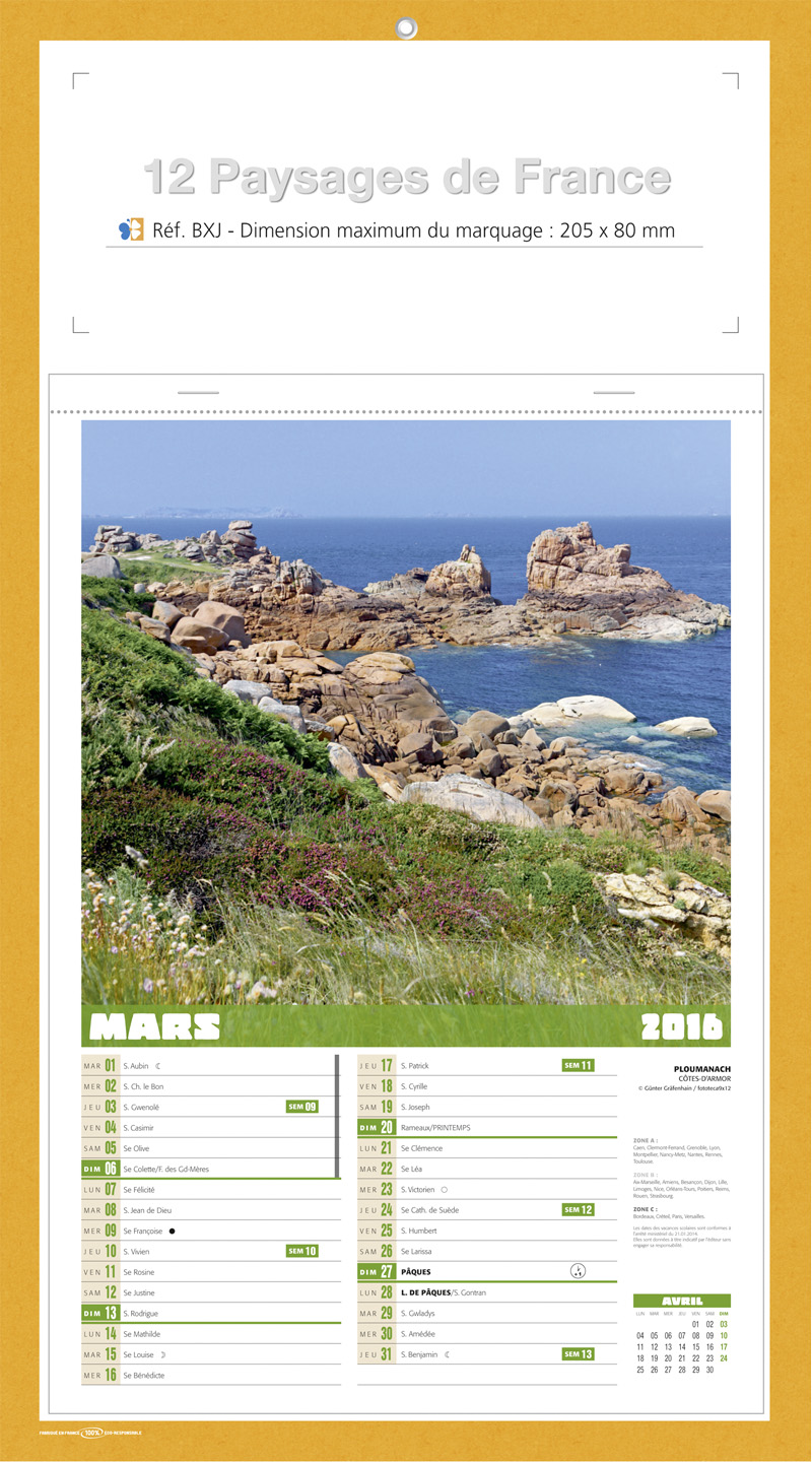 Pour marquer la différence entre vous et vos concurrents, utilisez de bons outils de communication qui vous valorisent. Un calendrier avec une large place publicitaire peut vous aider à vous imposer comme leader dans votre domaine d'activité. Il vous permettra de maintenir une bonne relation avec vos clients, partenaires et collaborateurs et aussi d'atteindre d'autres cibles. Offrez le calendrier Paysage français à votre public. Il vous permettra d'améliorer votre image car il est attractif et séduisant. Son support est en carton couché 400g, il possède 12 feuillets couché brillant qui sont facilement détachables après utilisation. Notre calendrier est mensuel et les utilisateurs peuvent y faire des annotations grâce aux espaces réservés en face des dates. Sur ce calendrier, les congés scolaires, les fêtes annuelles et semaines numérotées sont clairement visibles pour s'adapter à ceux qui souffrent de maux d'yeux. Nous vous avons réservé une zone de 205 x 80 mm pour vous adresser à vos clients en leur publiant vos produits. Kelcom vous offre l'occasion d'offrir la qualité à vos cibles. Contactez-nous dès maintenant pour améliorer votre image à travers nos produits publicitaires. N'hésitez pas, nous sommes là pour vous.