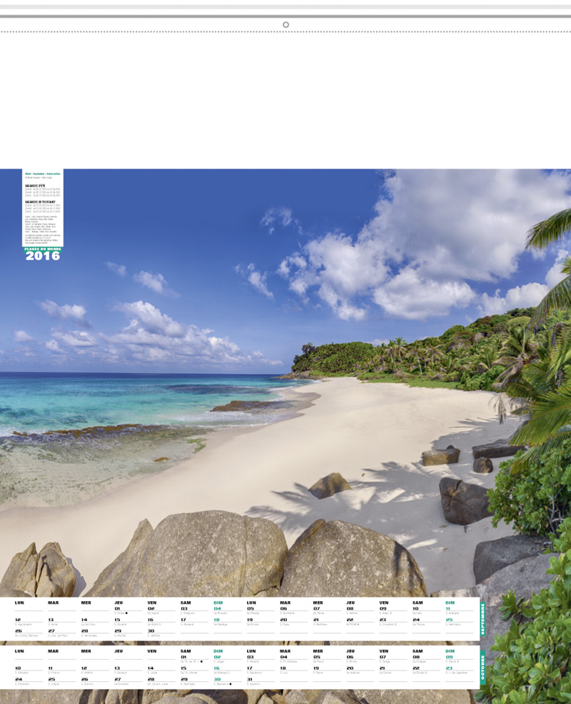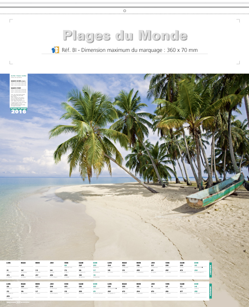 En affaires, de petits cadeaux peuvent vous permettre d'améliorer votre image pour maintenir de bons rapports avec le client. Offrir un calendrier à vos partenaires est un petit geste qui peut déclencher leur sympathie. Kelcom offre la possibilité aux structures de renforcer leur portefeuille clients à travers le calendrier publicitaire plage. Il aide les partenaires à organiser efficacement leurs vacances sur une plage. Outre son utilisation initiale il peut embellir la maison. Notre calendrier publicitaire de plage est composé de 6 feuillets couchés brillant de 135g détachables et reliés par une baguette thermoformée qui le prédispose à être suspendu à un support. Il est imprimé en français et en anglais pour permettre à un grand nombre de personnes de l'utiliser. Le caractère d'impression est bien visible pour donner plus d'efficacité à ce produit publicitaire. Avec un espace de marquage de dimensions 220 x 90 mm, vous pouvez vous adresser à vos cibles pour leur faire connaître vos produits et services. Offrez du plaisir à vos clients en leur permettant de contempler depuis chez vous la belle plage. Contactez Kelcom pour tous vos projets publicitaires. Nous vous offrirons des supports de qualité.