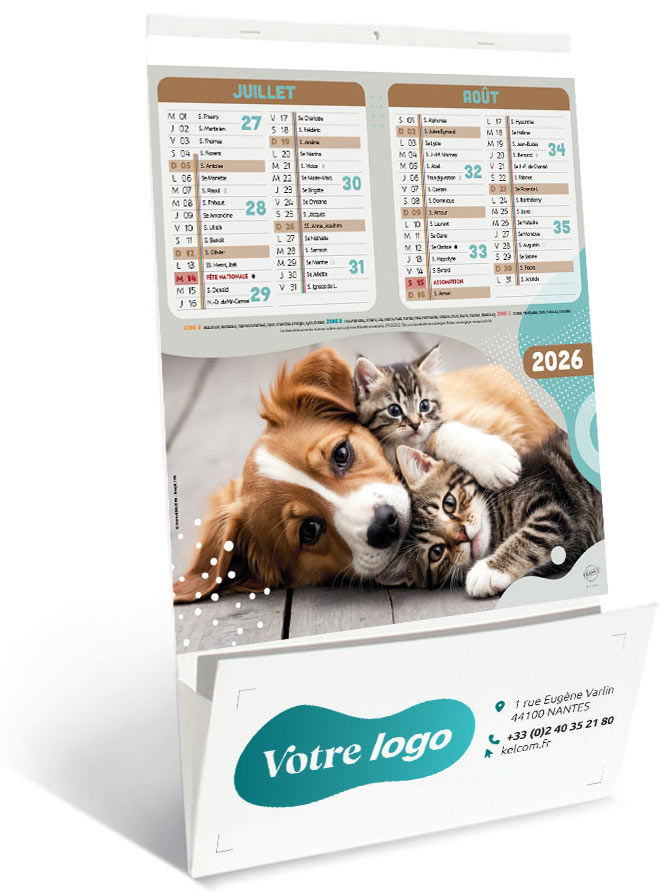 Les professionnels soucieux de soigner l'image de leur entreprise feront preuve de générosité à l'égard de leur clientèle en lui offrant un cadeau publicitaire. Avec un calendrier personnalisé avec le nom et le logo de votre marque, vous rendez un service généreux à de nombreuses personnes, tout en vous assurant une promotion durable et à moindre coût au fil des mois. Le calendrier personnalisable Chats et Chiens est un modèle mural doté d'un trou de suspension et d'un vide-poches. Chacune de ses pages affiche une photo présentant des scènes d'amitié entre les chiens et les chats. La partie du bas de page est une grille bimensuelle affichant toutes les informations importantes sur le déroulement de l'année (vacances, jours fériés, fêtes, lunaisons, changements d'heure, numéros de semaine). Ce calendrier publicitaire est idéal pour séduire les personnes qui cherchent à s'équiper d'un accessoire pratique et complet. Pour vous garantir un produit de qualité, nous avons opté pour une impression sur papier couché brillant 100g. Avec KelPrint, les professionnels généreux qui, comme vous, sont désireux d'offrir un cadeau publicitaire de qualité à leurs clients, trouveront des centaines de modèles à petit prix. Nos équipes expérimentées sont à l'écoute de vos besoins pour vous aider à créer un cadeau personnalisé haut de gamme, tout en respectant votre budget.