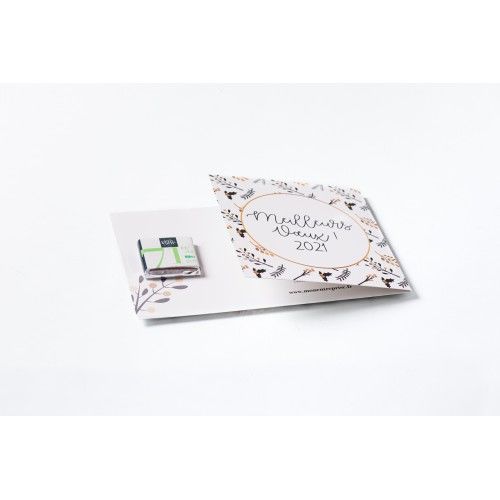 Carte 2 en 1, cette carte porte-bonheur se compose d'une partie détachable contenant un trèfle à 4 feuilles qui se glissera dans le porte-feuilles de vos clients