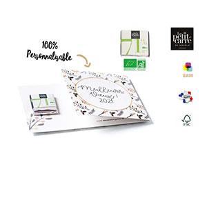 Pour la fin d'année, nous vous proposons un nouveau support de communication : une carte de vœux/coffret 100% personnalisable avec un assortiment de chocolats 100% création Personnalisation TOTALE